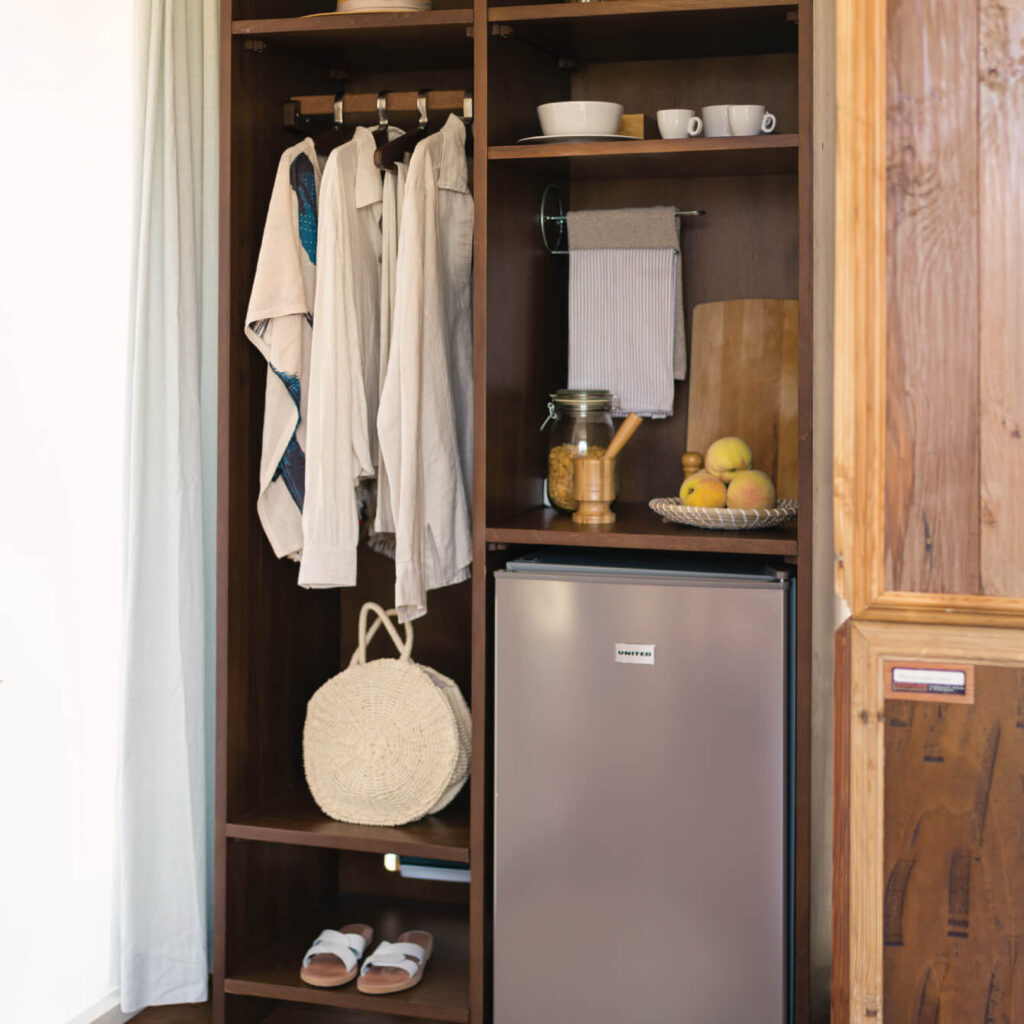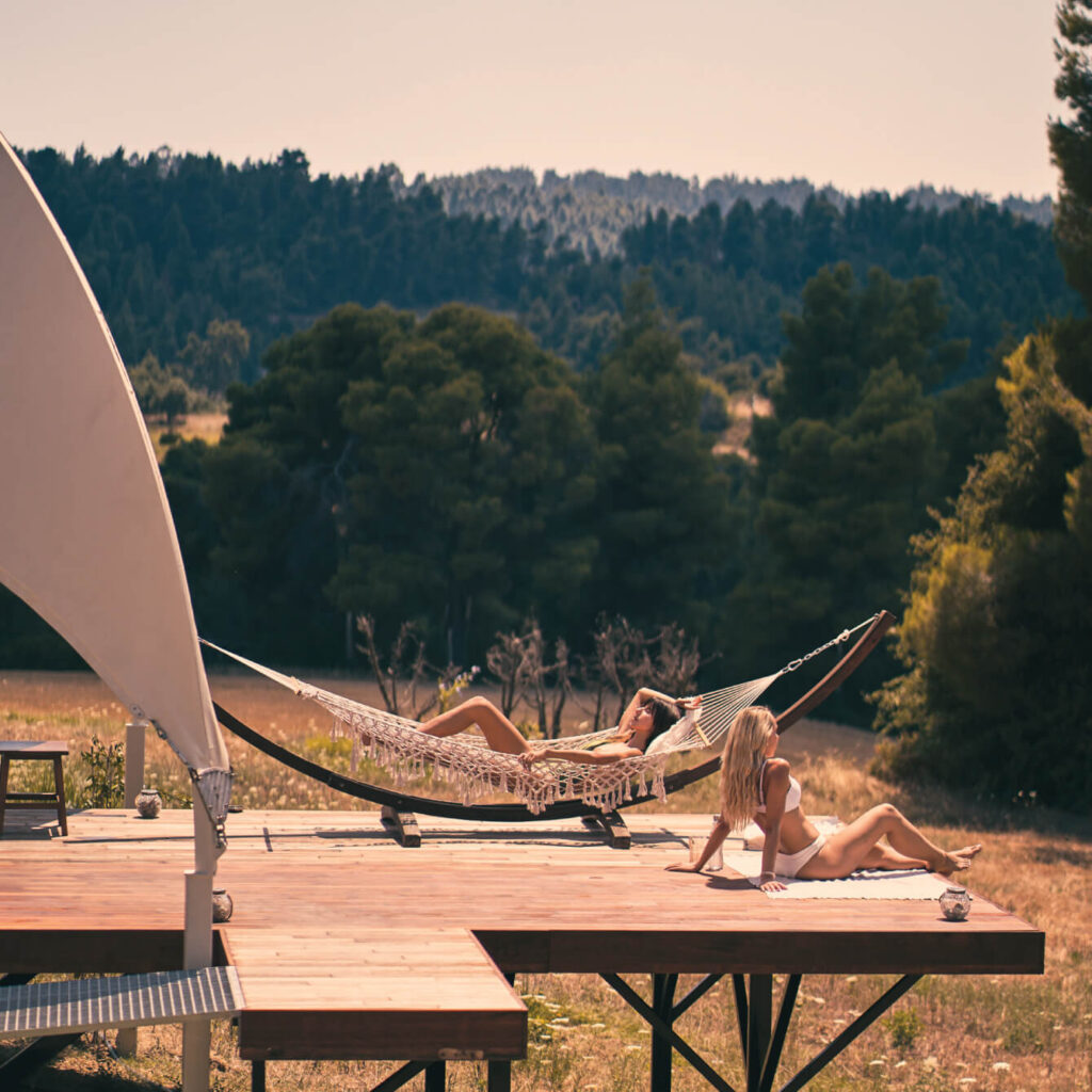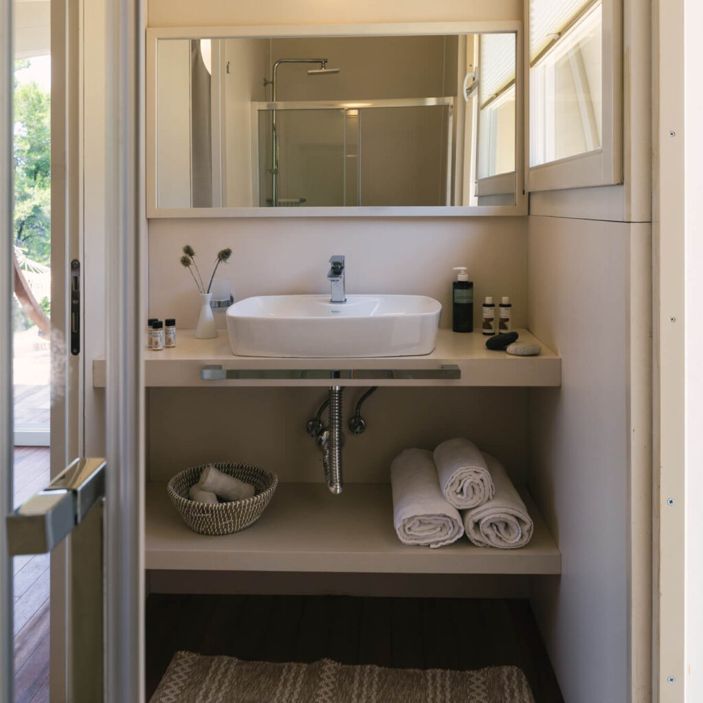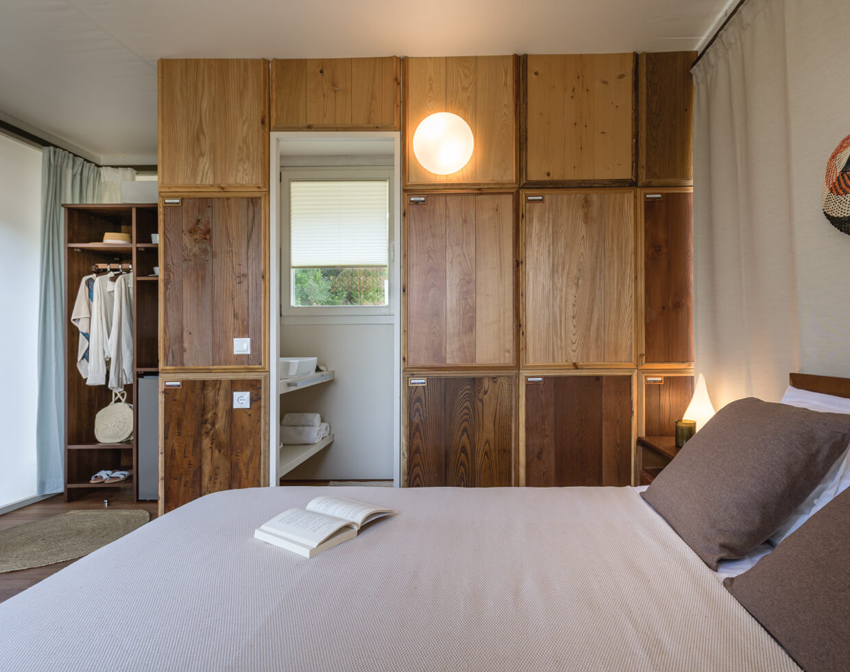 Custom-designed furniture from iTem unique line, crafted by hand especially for the Bell Tent and made of solid wood. Complementing the comforts of the Bell Tent – eCamp, come the majestic views of the forest from the private terrace.